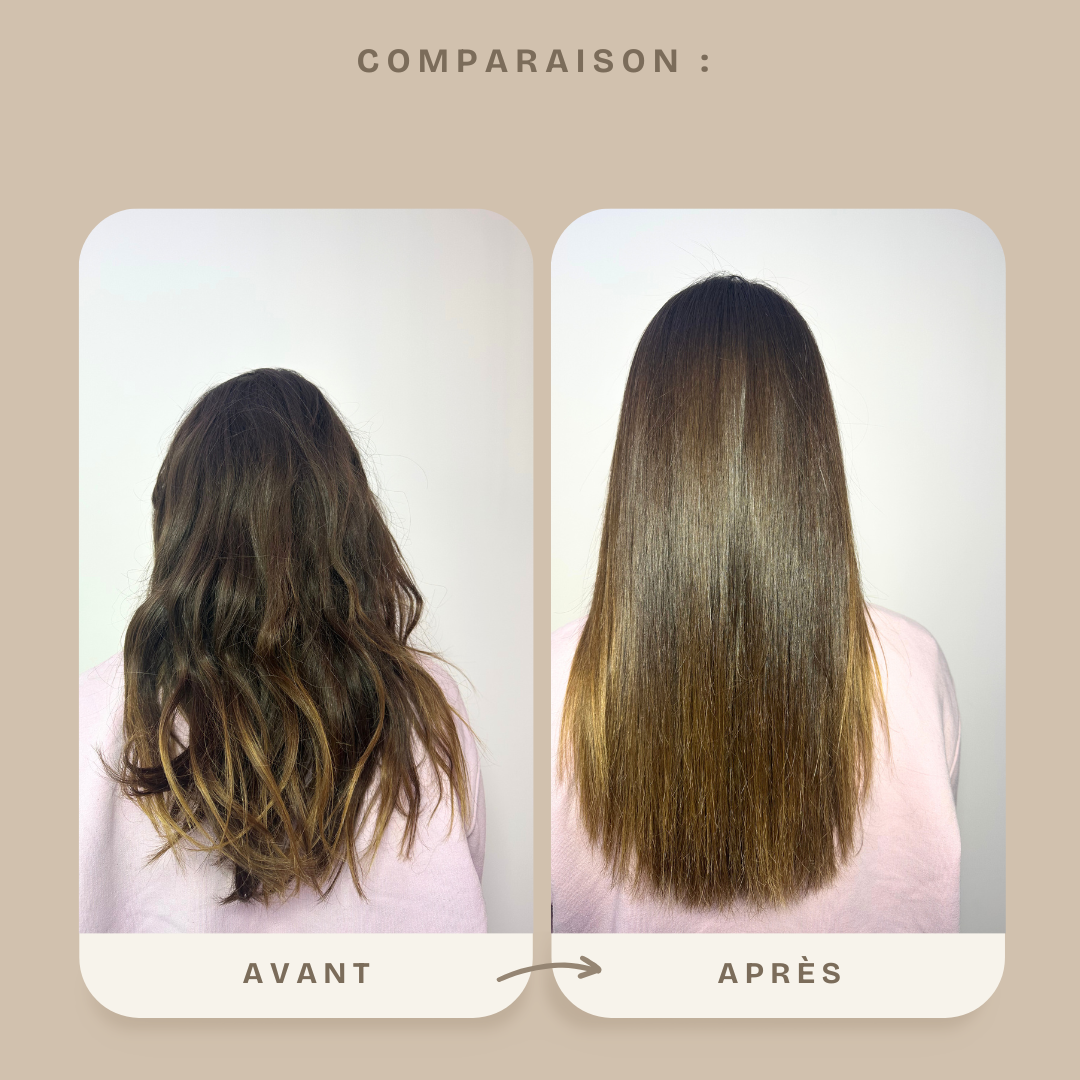 🧴Lissage : Appliquez sur cheveux essorés, après avoir utilisé le shampoing clarifiant, appliquer le lissage mèche par mèche à 1cm de la racine.